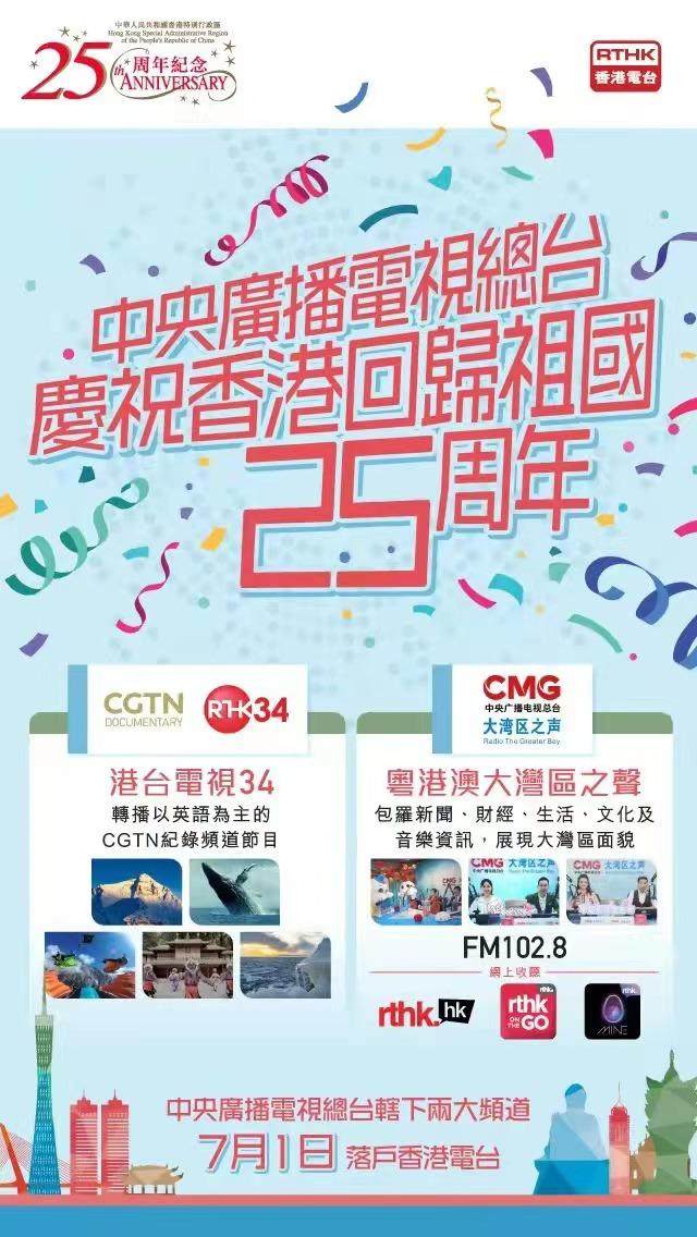 Honkonški građani su dobili još dva nova kanala za promovisanje politike centralne vlade i nacionalne stragetije razvoja, nakon što su počeli sa emitovanjem Generalnog kanala (CCTV-1), Međunarodnog kanala (CCTV -4), Kanala opere (CCTV-11) ), Informativnog kanala (CCTV-13), CGTN informativnog kanala na egleskom CGTN-a i Radio glas Hongkonga.
