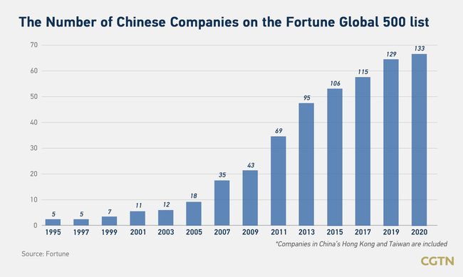 Ukupno 133 kineske kompanije uvrštene su na listu „Global 500“, koju je nedavno objavio američki magazin "Forčun", uključujući hongkonške i tajvanske kompanije. Kineske kompanije preuzele su dominaciju na listi. SAD su zauzele drugo mesto sa 121 preduzećem.