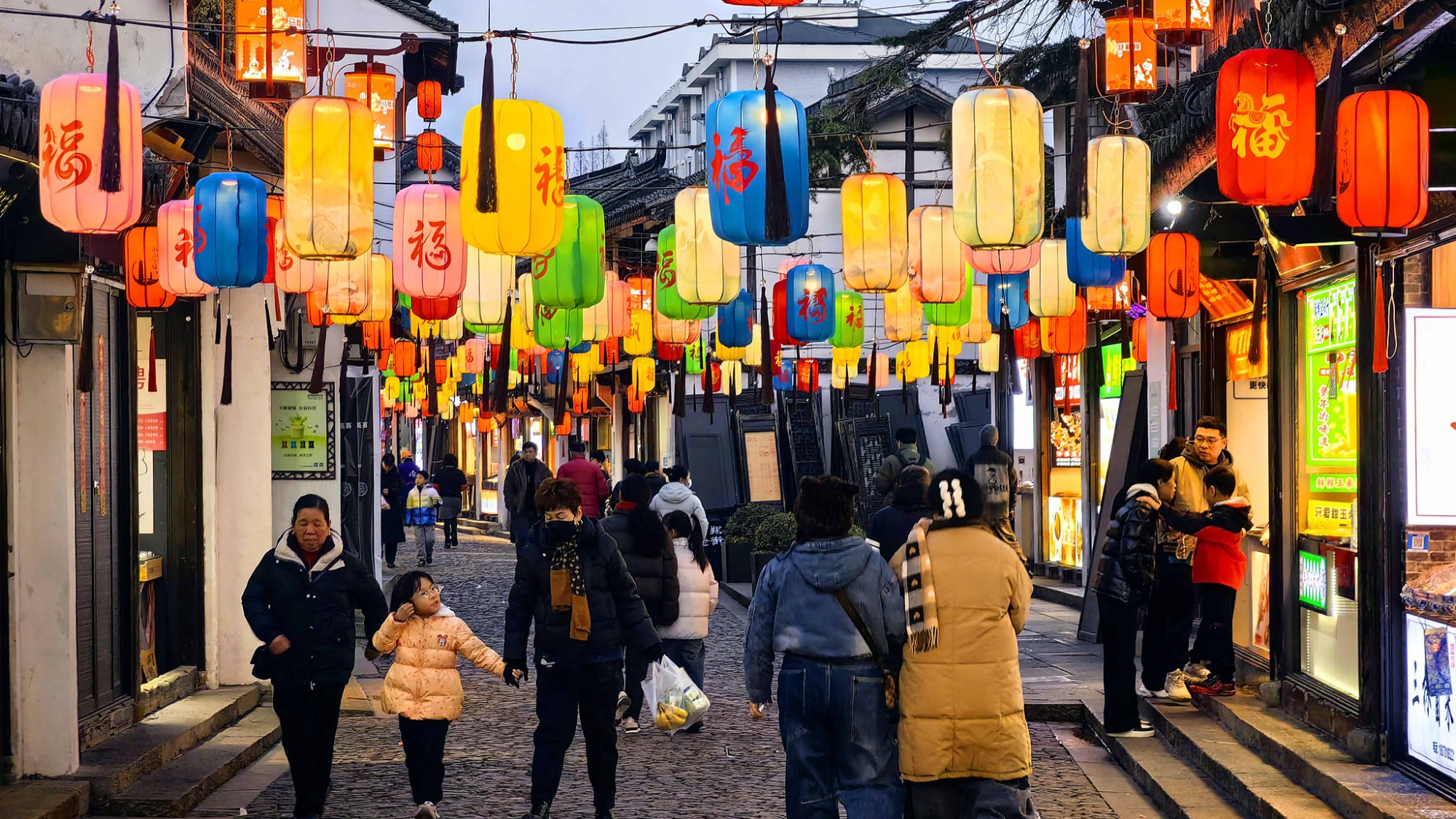 Sa približavanjem Godine konja, tradicionalni narodni običaji u drevnom okrugu Nanšijang, u Šangaju, u punom su jeku. Lamponi nematerijalne kulturne baštine i moderni lampioni sa iscrtanim likovima međusobno se dopunjuju.