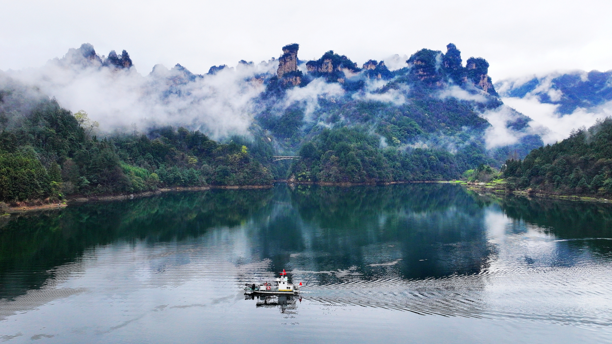 Tokom prolećnih kiša, Nacionalni šumski park Džangđijađije u provinciji Hunan obavijen je morem oblaka. Magla i karakteristični kameni vrhovi stvaraju upečatljiv prizor, privlačeći brojne domaće i strane turiste.