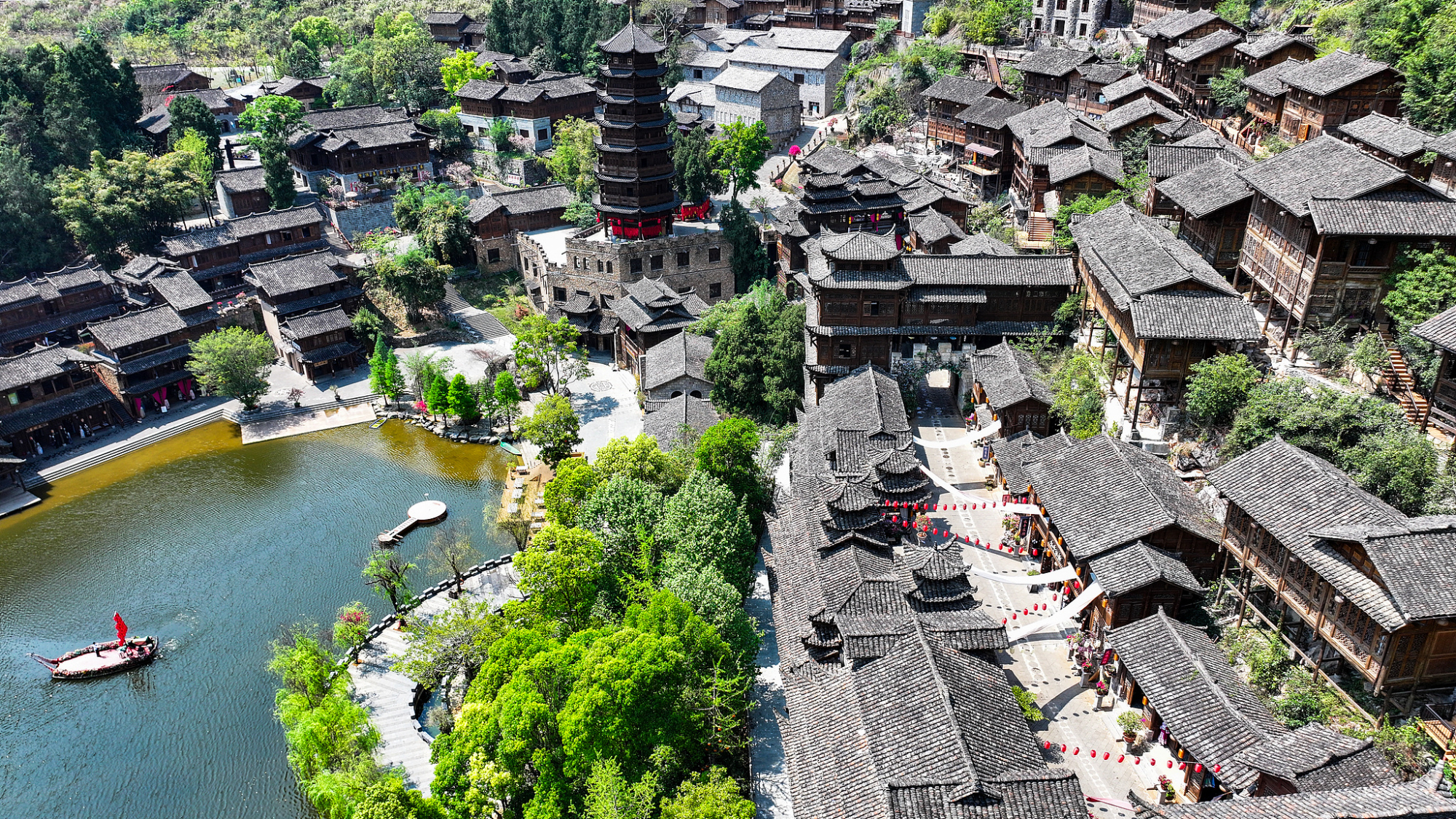 Zelene planine, reke, cveće i neobične drvene zgrade na stubovima, u živopisnom području Fenglin Buji u gradu Singjiu, u provinciji Guejdžou, dopunjuju se, stvarajući slikovit prolećni prizor.