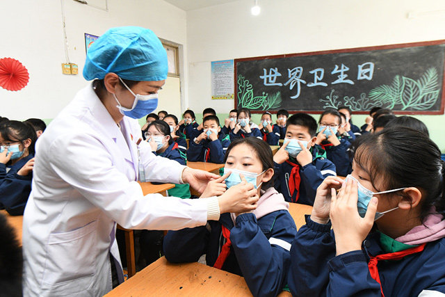U jednoj oglednoj osnovnoj školi u gradu Šiđijadžuangu u severnoj provinciji Hebei, medicinski radnici učenicima pokazuju kako se pravilno nosi maska za lice.