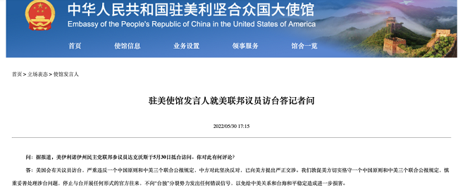 Poseta američkog zvaničnika Tajvanu ozbiljno krši princip jedne Kine i tri zajednička saopštenja između Kine i SAD-a. Kineska strana se tome odlučno suprotstavlja i uputila je demarš američkoj strani.