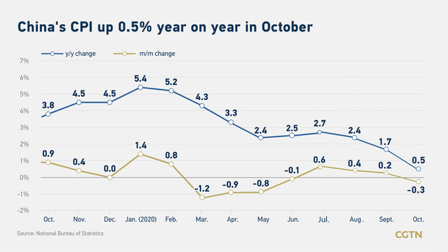 Kineski indeks potrošačkih cena (CPI), glavni pokazatelj inflacije, porastao je za 0,5 odsto u oktobru u odnosu na isti period prošle godine. On je za 1,2 odsto manji nego u septembru, uglavnom zbog pada cena svinjskog mesa, saopštio je danas Nacionalni zavod za statistiku.
